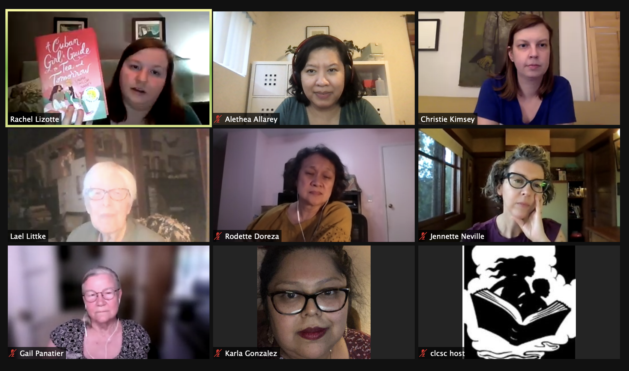 A screenshot of the CLCSC Book Club members discussing Laura Taylor Namey’s A Cuban Girl’s Guide to Tea and Tomorrow on a Zoom meeting