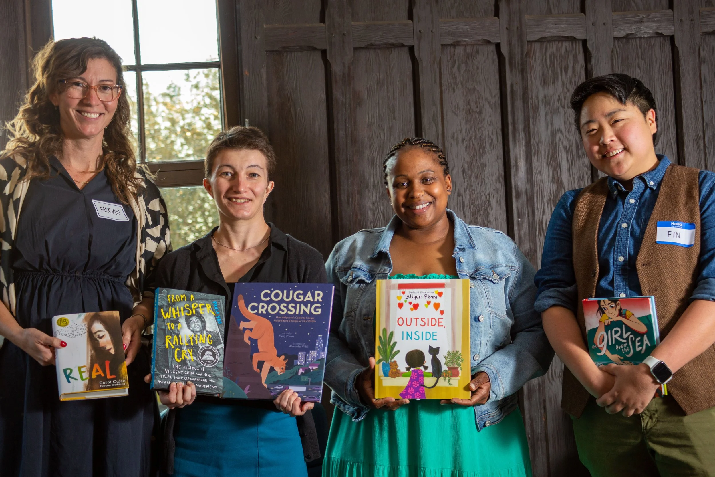 The 2022 CLCSC Awards Committee (from left to right): Megan Panatier, Annalisa Engh, Erika Morris, Fin Lee. Photographed by Josh Steichmann at Throop Church in Pasadena, CA.